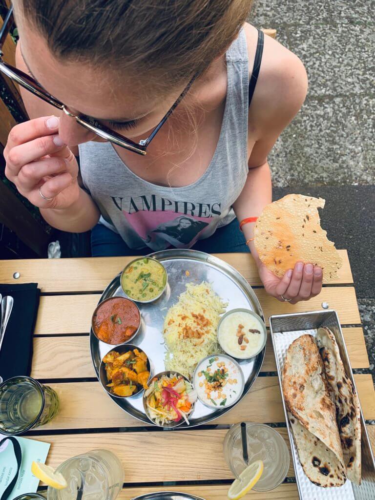 The menu here is a mix of classics- butter chicken, dosas, dal makhani plus street food classics like chaats and kebabs. Usually I don’t go for cocktails at an Indian but they were so good here. Sabrina had a Dirty Mango Lassi (€10.50 )— mango lassi, coconut rum and Bailey while I had their Chai Whisky Sour ( €11.50 )- so tasty.For starters we went for Aloo Tikki chaat (€9.50 ) – a crispy potato patty topped with yogurt & chutney. OMG. 10/10. Then the Hara Bhara Kebab ( €9.50) which is a spiced spinach potato pea patty which you dunk in a green chutney. Again, fab.